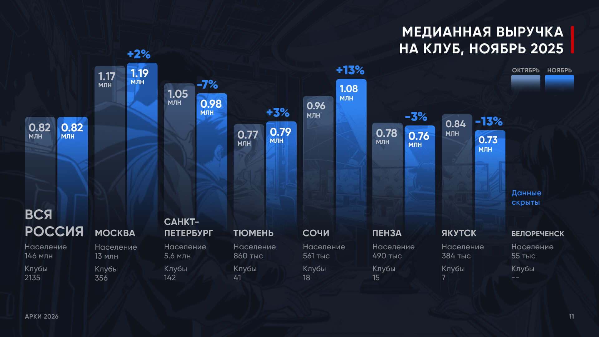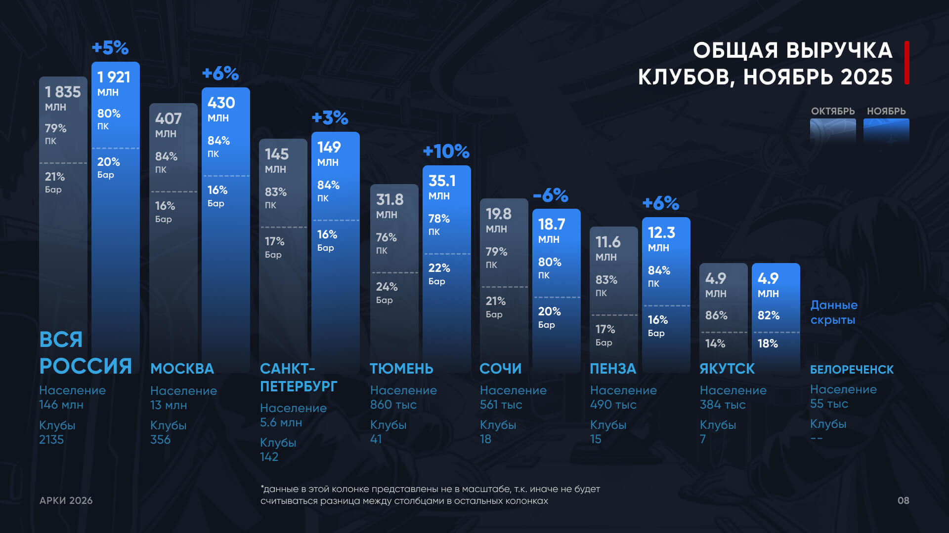 Барометр индустрии компьютерных клубов и киберарен собирается на базе данных, предоставленных партнерами Ассоциации развития киберспортивной инфраструктуры (АРКИ). Это более 2000 компьютерных клубов по всей России, включая крупнейшие франшизы (COLIZEUM, CyberX, Strike Arena), а также экосистема LANGAME и Организация развития видеоигровой индустрии (РВИ). Статистические данные, указанные в отчетах барометра, собраны на базе указанного в соответствующей колонке числа клубов.