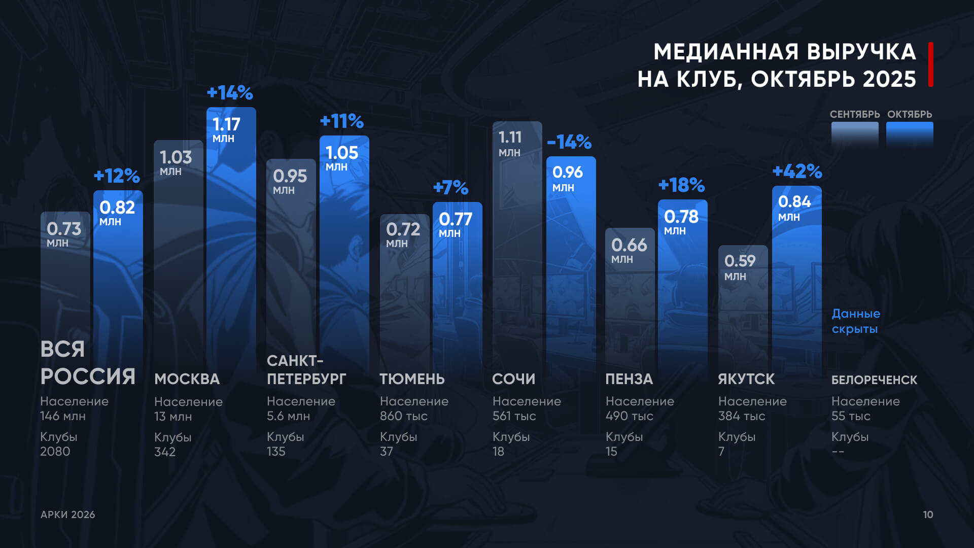 Медианная выручка клуба по РФ колебалась в районе 750 000 рублей. При этом медианная выручка клуба в Москве и медианная выручка клуба в Якутске отличаются всего вдвое, хотя население столицы в 34 раза больше.