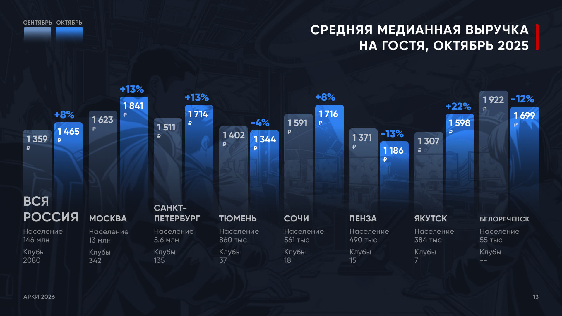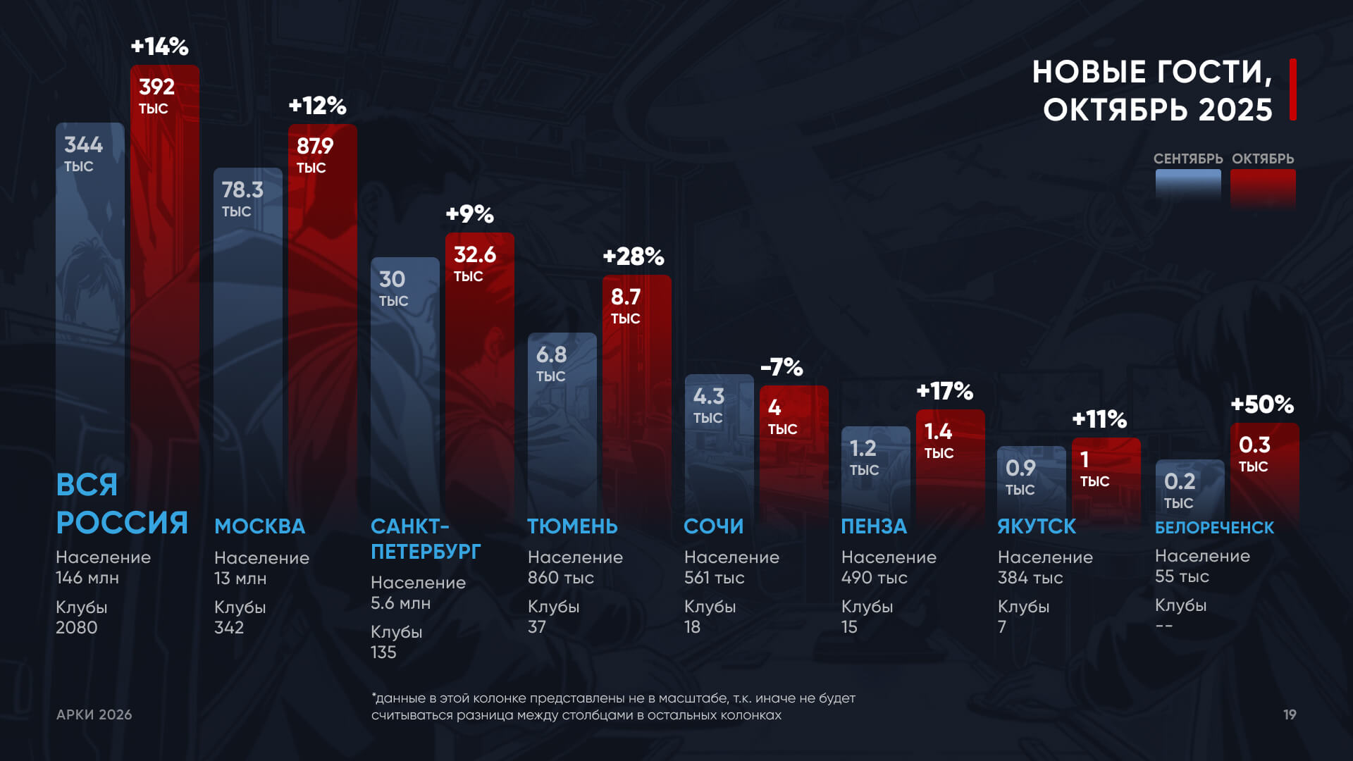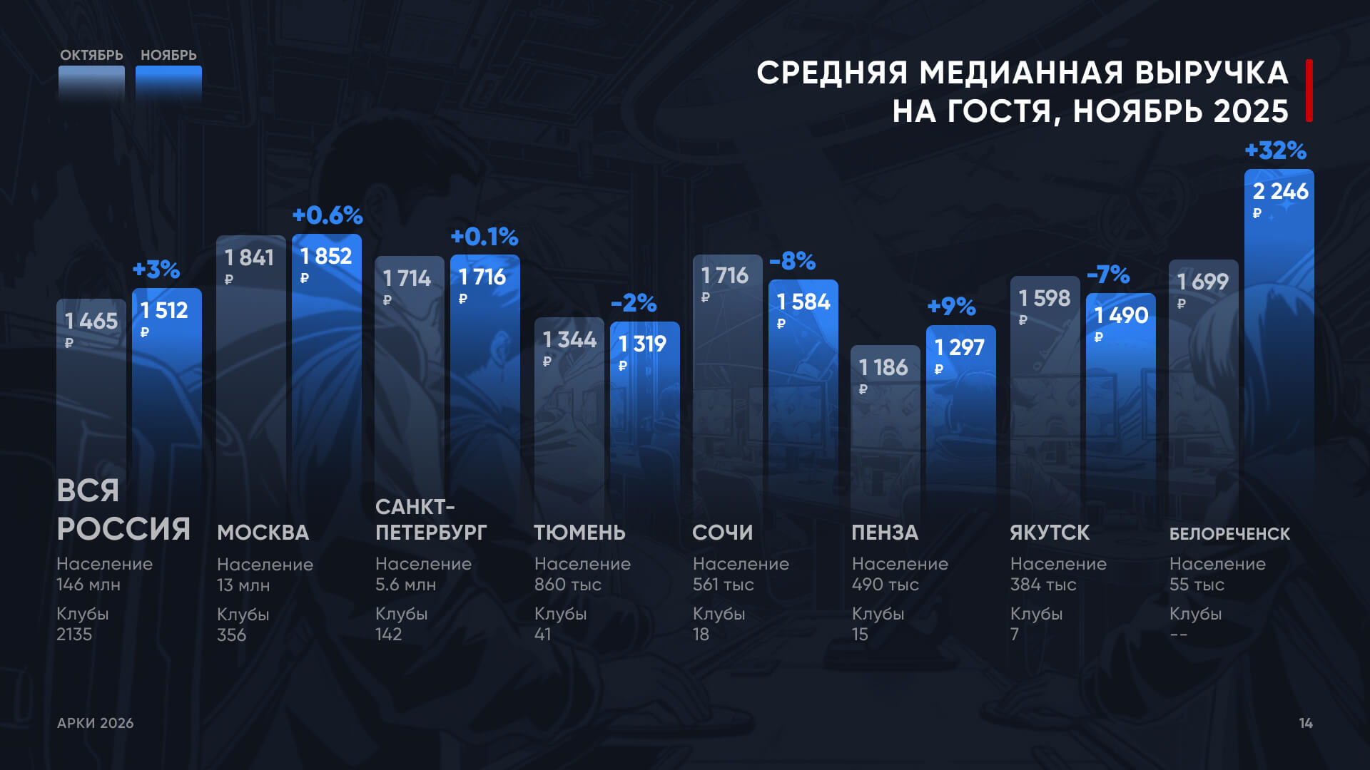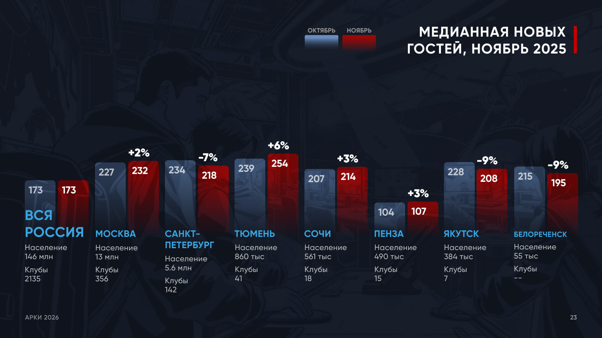 В клубах в маленьких городах гости могут тратить столько же, сколько и в мегаполисах. Это объяснимый тренд, т.к. в небольших городах выбор досуговых площадок ограничен, и жители активнее проводят время в любимых клубах.