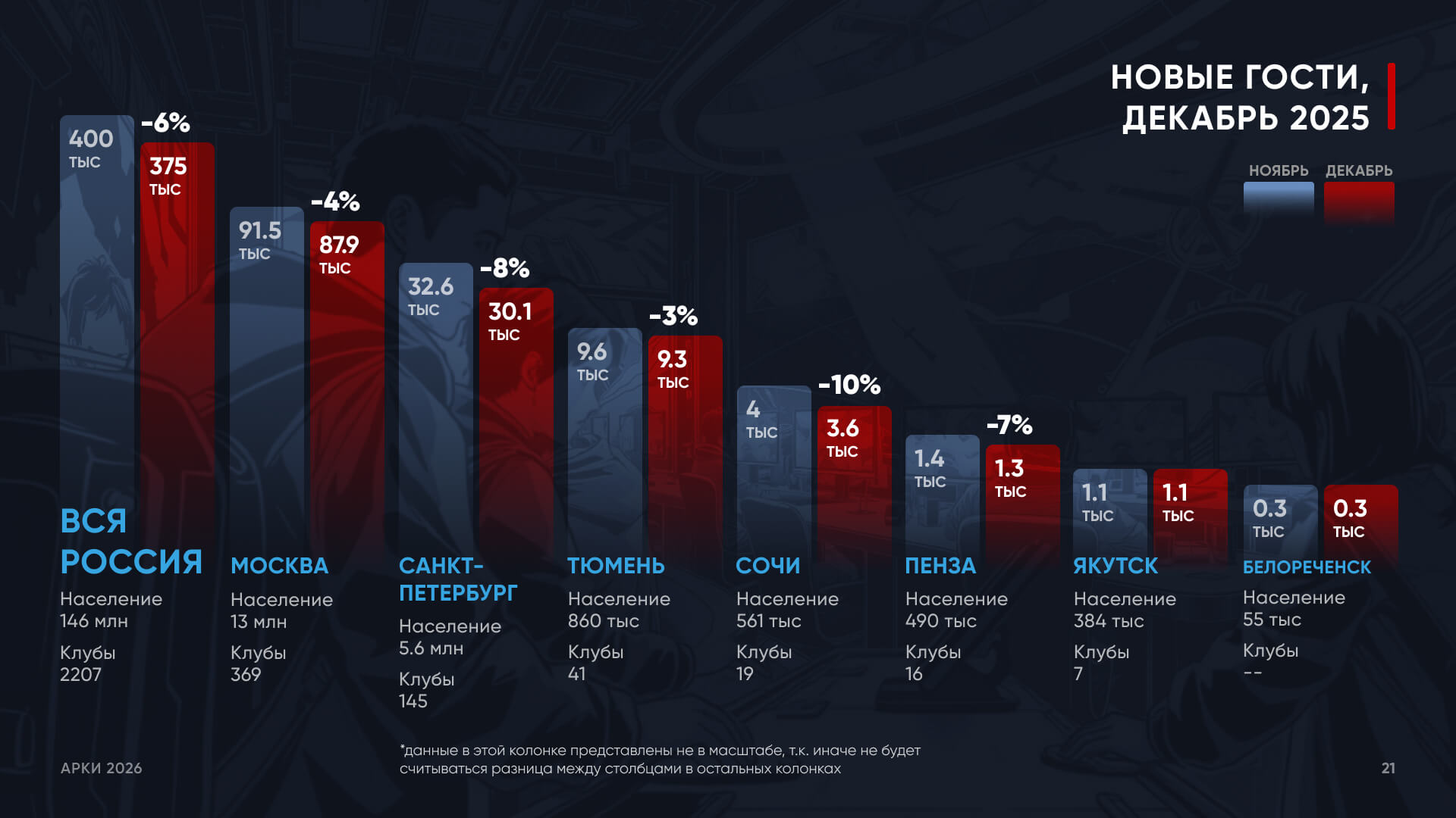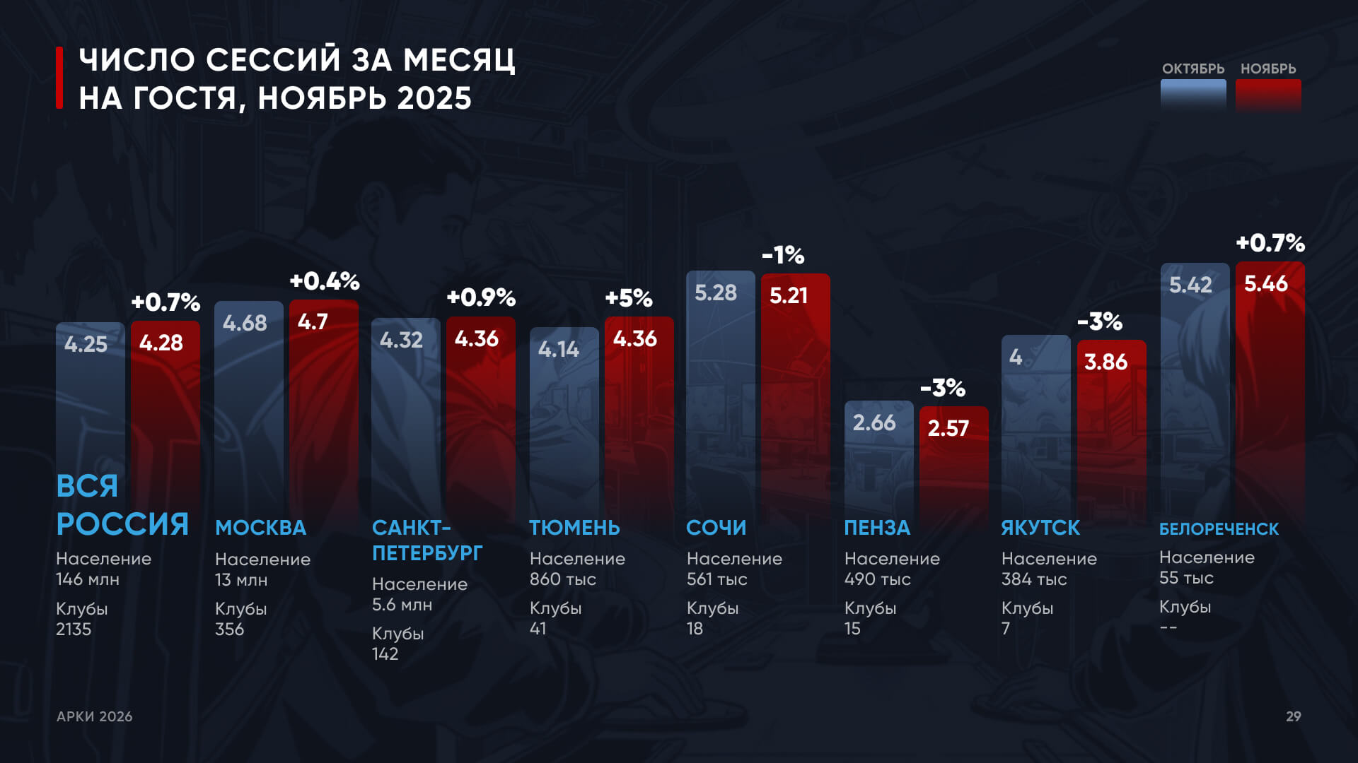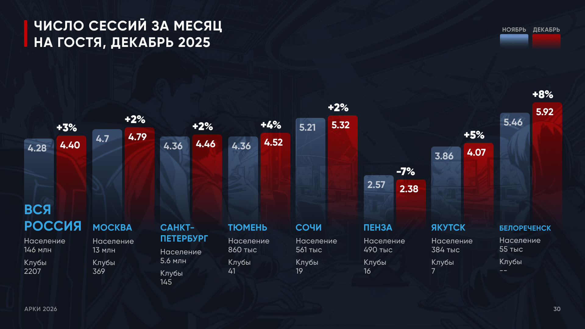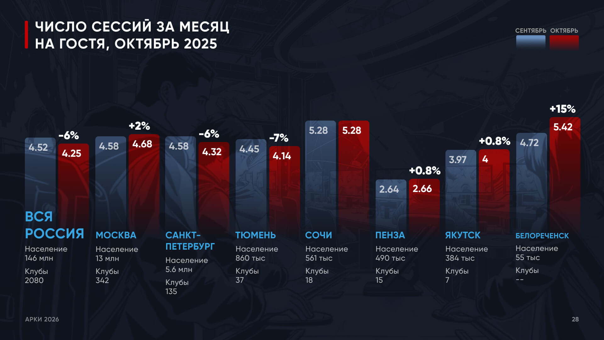 Регионы по-прежнему в тренде. Там, в отличие от мегаполисов, число имеющихся и открывающихся клубов пока не удовлетворяет спрос геймерской аудитории. При этом финансовые показатели многих региональных клубов уже сопоставимы с выручками в больших городах при меньших затратах на открытие. Это подтверждает, что аудитория в регионах охотно посещает современные площадки и готова проводить там свой досуг. Потенциал регионального рынка не исчерпан, у него хорошие перспективы.